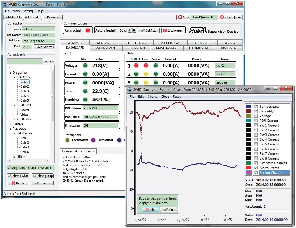 In the era of globalization, data communication devices and people who manage them are often miles apart, while the devices themselves are scattered over great areas, creating locally smaller and larger systems. To make remote managing of data communication infrastructure with MPSM-S1 devices as convenient as possible, we created Windows-dedicated software. Using a built-in address book, the software connects to a specific MPSM-S1 device to perform configuration, retrieve and save data. This way, you can manage and control large systems from a single location. The application consists of tabs containing all the functions of the MPSM-S1. The first tab – DASHBOARD – is the instrument panel which contains the key parameters measured by the device. The panels include also the ARCHIVE tab with filters that you can use to download and view historical data, such as measurements, events, alarms, configuration changes. You can generate as many windows with historical data as you want so you can compare the data in various configurations based on selected filters. Data can also be exported to a CSV file and then imported into Excel, for example. The application has a "back to the past" feature where you can select any point on the archives diagram to go back to that moment in time to see measurements, events, alarms and configuration. The data will be presented in the main application as if they were happening right at this moment. MPSM-S1 supports SNMP protocol in read mode. The software comes with an SNMP tree model as a MIB file which can be imported into your control systems. The device also supports TRAP, meaning it sends alarm and event notifications to predefined servers. Codes and descriptions of TRAPs are included with the software.