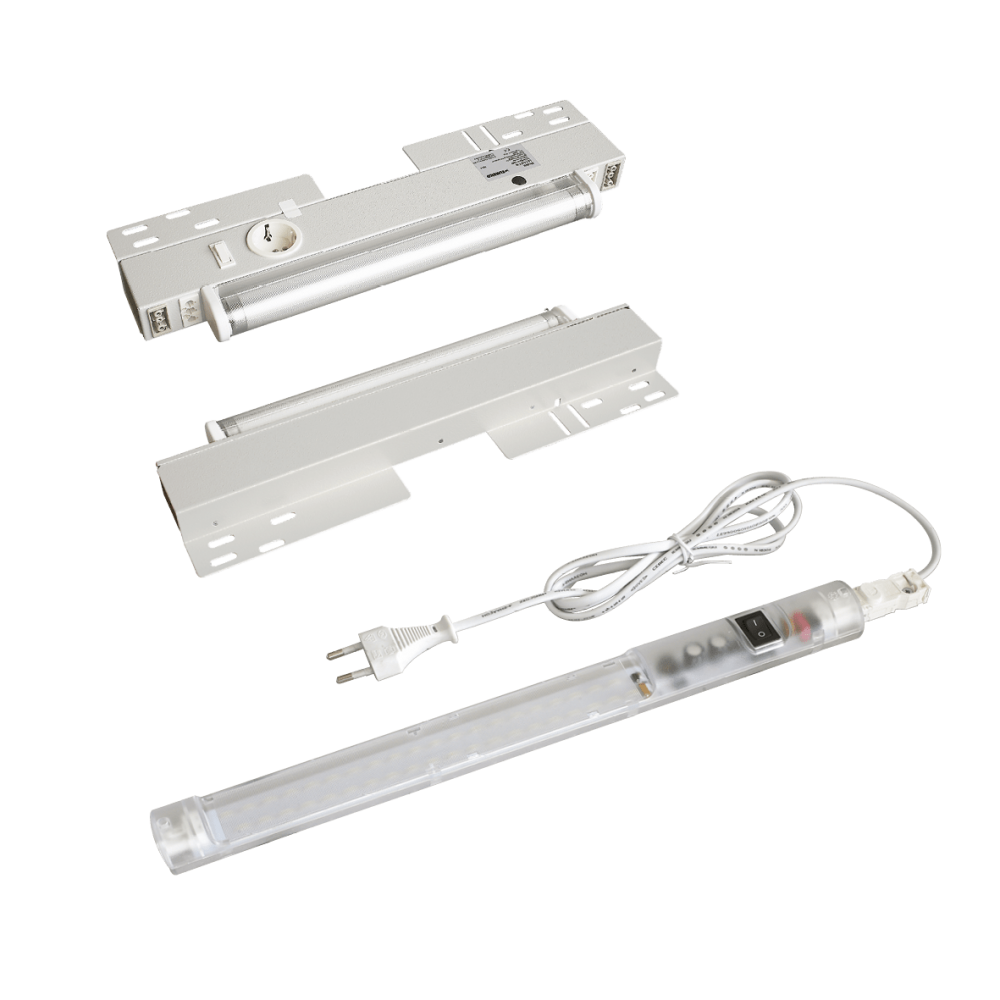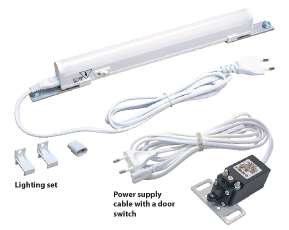 Electric light fitting fixed into the horizontal profile of the cabinet’s frame. Equipped with a Schuko power socket (max. 16 A) and 0-1-AUTO switch. Possibility of direct power supply or use of the connecting cable from an adjacent lighting fitting. Possibility of door switch control.