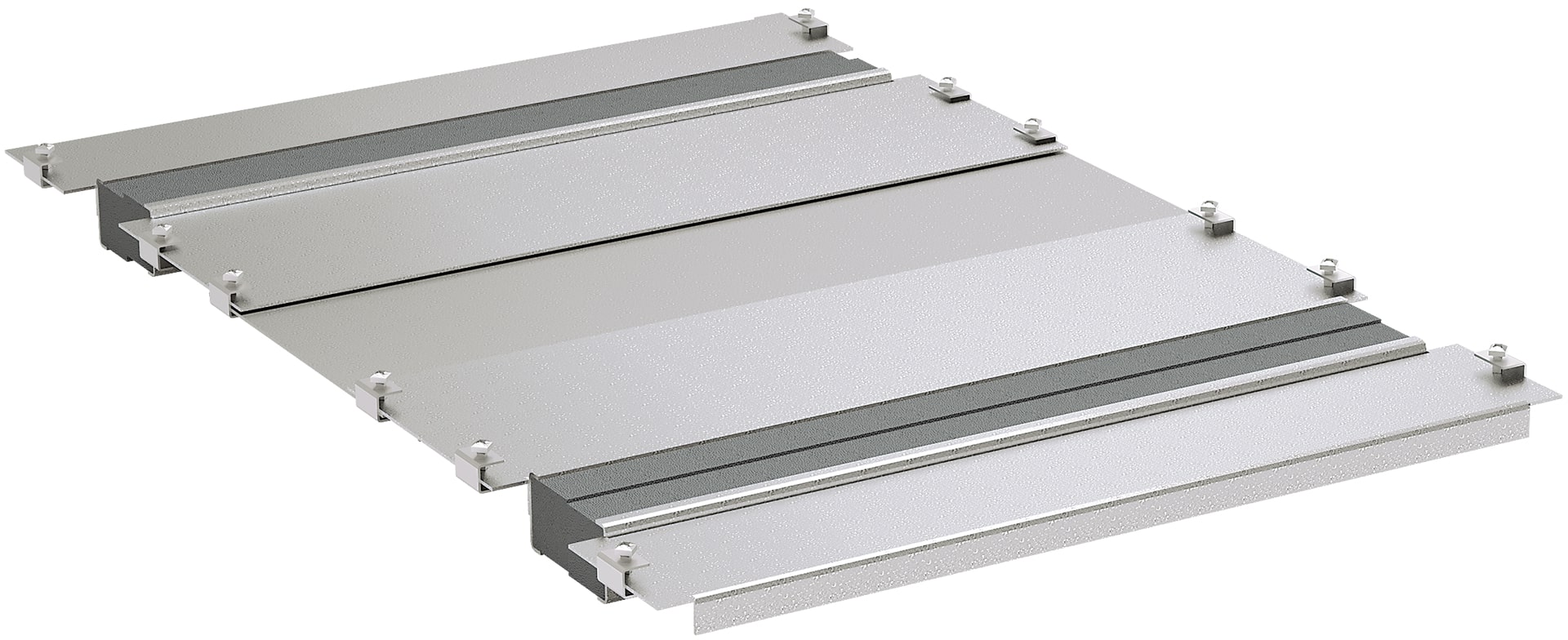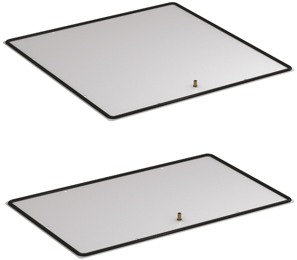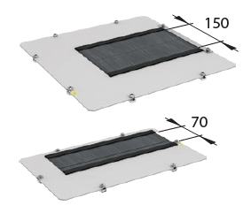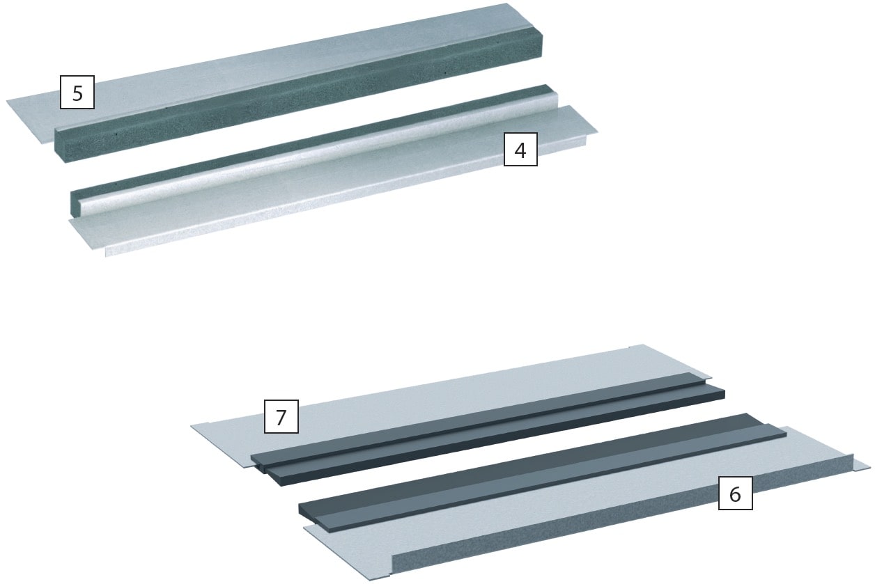 Set of 2 sliding gland plates with foam strip (No. 4 and 5) or brush strip (No. 6 and 7). Used for one opening in SZE3 cabinet bottom plate (note: 1000 and 1200 mm wide cabinets have two openings in the bottom plate).
