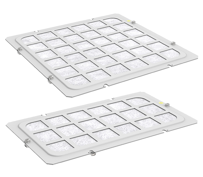 Sliding gland plates with foam strip (4, 5) or brush strip (6, 7) are intended for application instead of standard sliding gland plates (1, 2). They create a cable opening with adjustable width. Foam strip protects cable isolation lead into the cabinet from any defects, at the same time increasing the cabinet’s tightness. Brush strip protects against dust.