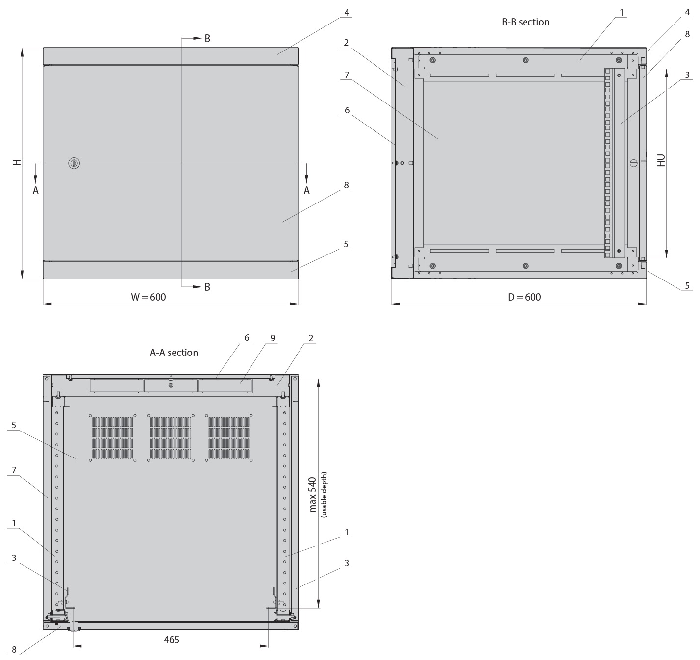 frame, steel door, panels, top and bottom plates, glass door side profiles – powder paint, light grey (RAL 7035).